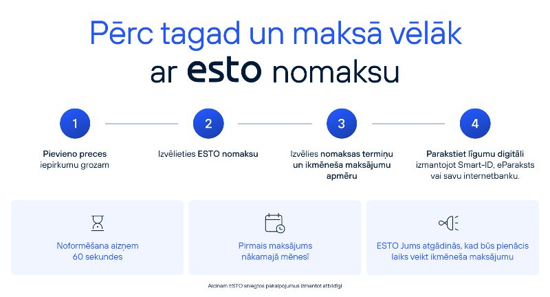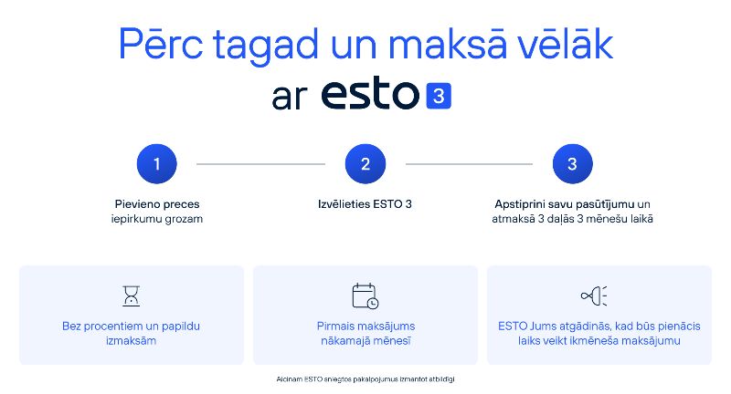 - Maksāt pa daļām. Maksājumu iespējams sadalīt 3 vienādās daļās(ESTO3) vai ilgākā periodā(ESTO nomaksa). Pakalpojumu nodrošina ESTO.